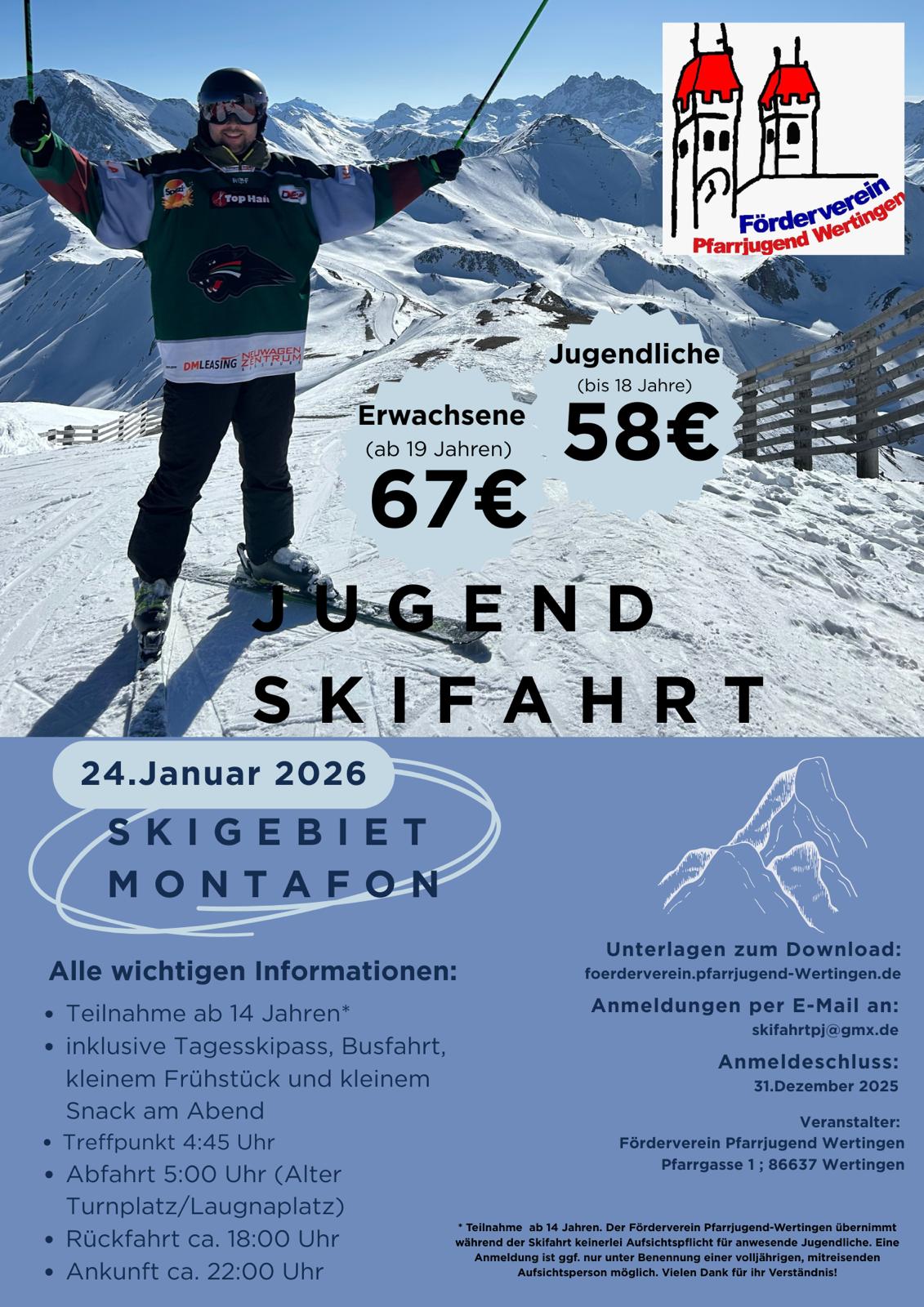 Der Förderverein Pfarrjugend lädt alle Interessierten zu einer Skifahrt ein. Die Fahrt ist am 24. Januar 2026. Ziel ist das Skigebiet Montafon. Anmeldung und weitere Infos gibt es hier.