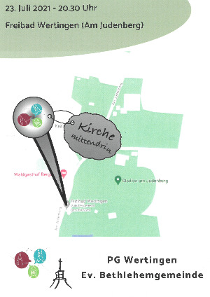 In ökumenischer Verbundenheit feiern die katholische Pfarreiengemeinschaft Wertingen und die evangelische Kirchengemeinde einen modernen Gottesdienst "mittendrin". Am Freitag, 23. Juli 2021 um 20:30 Uhr wird der Geottesdienst im Wertinger Freibad gefeiert.