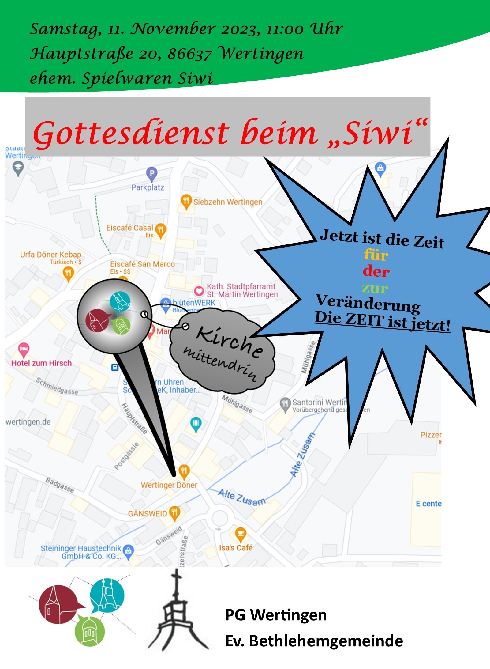 In ökumenischer Verbundenheit feiern die katholische Pfarreiengemeinschaft Wertingen und die evangelische Kirchengemeinde wieder einen Gottesdienst der Reihe "Kirche mittendrin". Der Gottesdienst findet im Laden des ehemaligen Spielwarengeschäftes Siwi statt am 11. November um 11:00 Uhr.